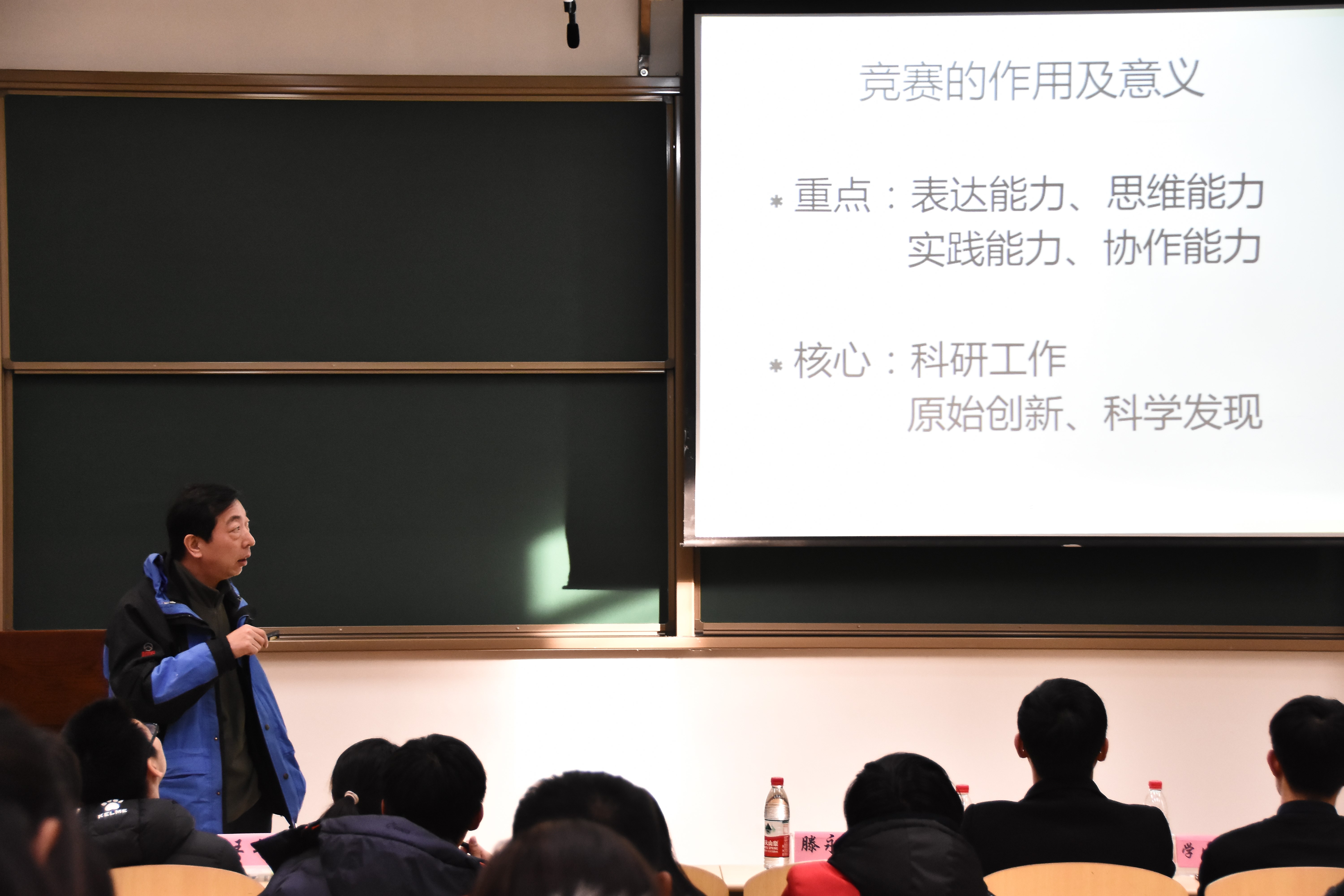 各位嘉宾依次上台进行讲解。其中,白洪亮老师简洁明了地介绍了学术竞赛的规则与赛制。他从各方面依次展开,通过举例子、交流等方式与台下同学互动,鼓励同学们坚持到底,争创佳绩。滕永杰老师则从理解题意、实验先行、理论构想、实验验证、理论与实验双螺旋发展、形成报告六大方面详细告诉同学们如何完成一个题目,并鼓励同学们多与指导教师交流,及时反映题目进展。现场同学聚精会神,认真聆听讲解。