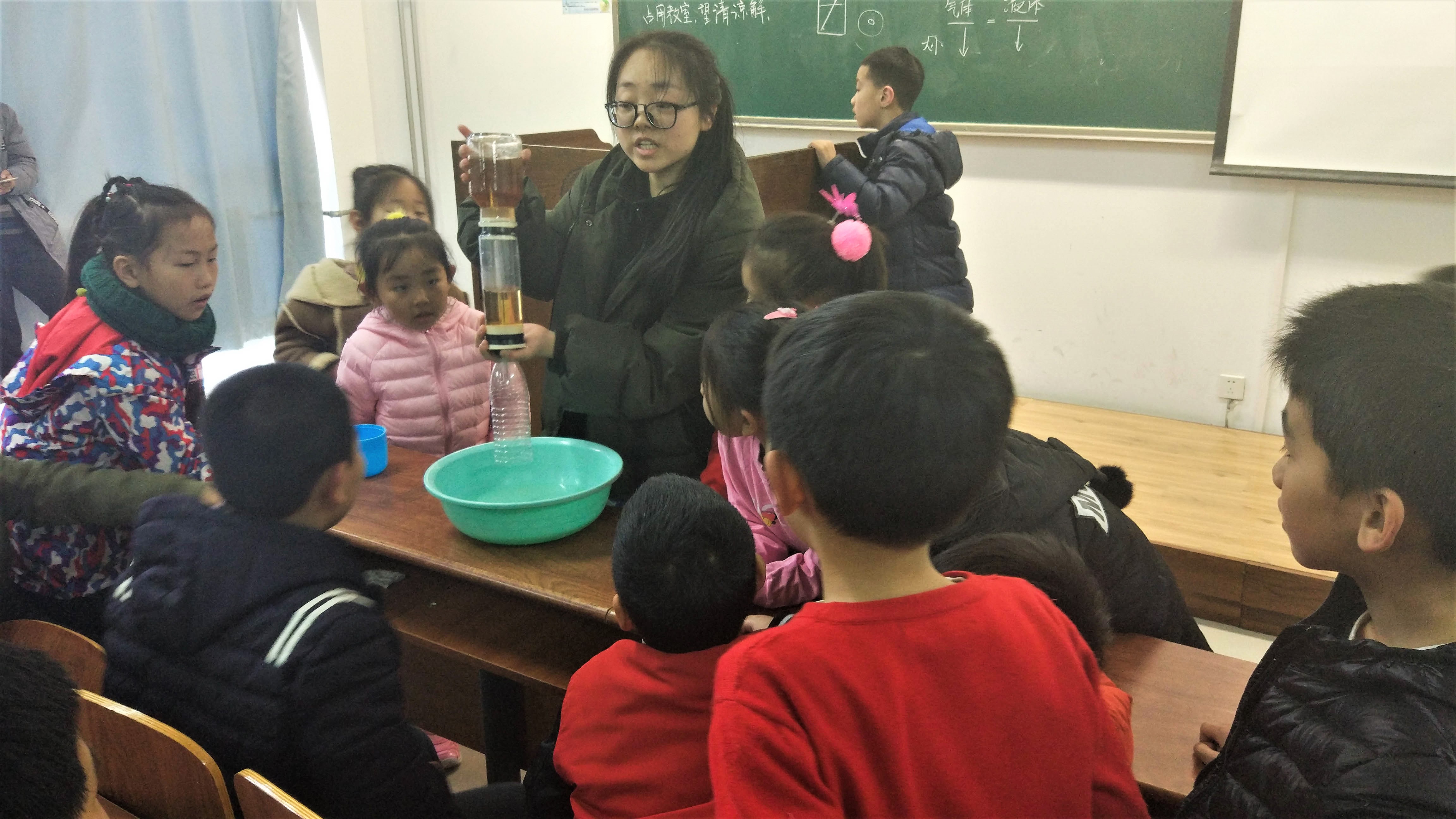 上午的喜悦尚未忘却,下午丰富多彩的活动紧随而至,在结束午餐之后,孩子们来到综合教学二号楼A108,开展科技小活动。受到精彩视频和趣味实验的吸引,孩子们异常活跃,纷纷举手上台体验实验的乐趣,偌大的教室时不时响起孩子们惊奇、赞叹的声音,喜悦之情不言而喻。